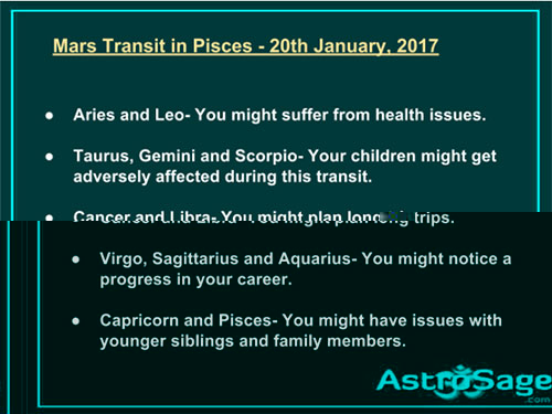 The transit of the planet Mars in the sign Pisces might make you easily irritable and give you a combative and hostile aura. Your inclination towards sensuality and intimacy might remain on an all time high during this transit period. You might also develop issues with your spouse and family members during this period. Try not bring your aggressive self forward to deal with issues that need to be dealt with a calm and composed mind. Situations might get provocative and tricky but dont lose your patience and handle them with your wit and maturity. Luck would be by your side to help you out. Professionals are predicted to do very well in their arena while this transit lasts.