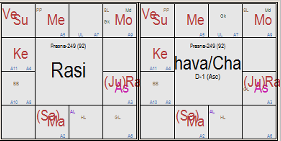 Here the sub lord of 6th house is Mars, he is in 4th house in the star of Saturn and sub division of Rahu. Saturn is in 4th house whereas Rahu is in 1st house in the star of Venus in 8th house. Therefore Mars is strong for 4-8 houses.