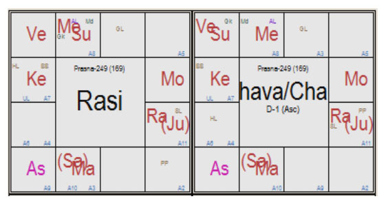Here the sub lord of 6th house is Venus, she is in 4th house in the star of Mercury and sub division of Kethu. Mercury is in 5th house whereas Kethu is in 3rd house in the star of Jupiter, therefore Venus is strong for 4-9 houses.