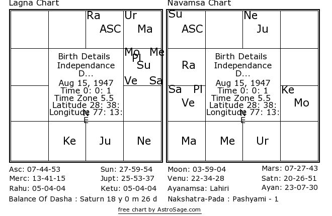 - ഇന്ത്യ സ്വാതന്ത്ര്യം നേടിയ ശേഷം ശനി, ബുധൻ, കേതു, ശുക്രൻ, സൂര്യൻ എന്നിവയുടെ മഹാദശ അവസാനിച്ചു, ഇപ്പോൾ ചന്ദ്രന്റെ മഹാദശ ആണ്.