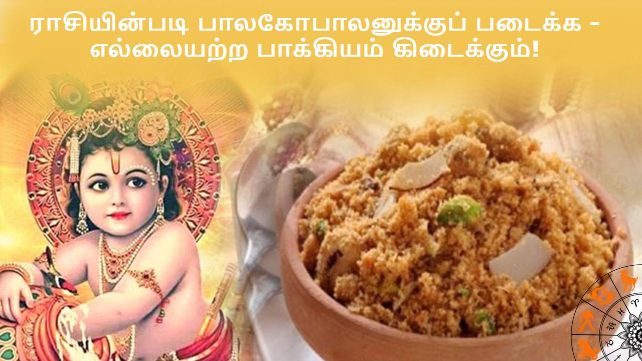 - விருச்சிக ராசிக்காரர்கள் கிருஷ்ணருக்கு சிவப்பு நிற ஆடைகளை அணிவித்து, மாவா, மகன், அல்லது நெய் ஆகியவற்றைப் போகத்தில் படைக்க வேண்டும்.