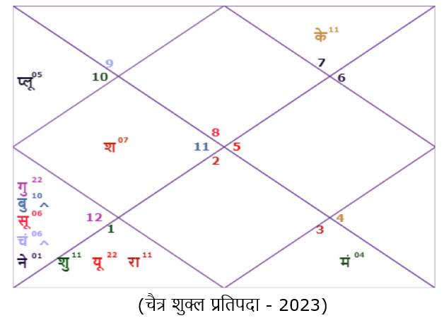 હિંદુ નવું વર્ષ 2023 (ચૈત્ર શુક્લ પ્રતિપદા) ની કુંડળી વૃશ્ચિક રાશિથી બનેલી છે. લગ્ન ભગવાન મંગલ મહારાજ કુંડળીના આઠમા ઘરમાં મિથુન રાશિમાં સ્થિત છે. શનિ મહારાજ ત્રીજા અને ચોથા ભાવમાં ચોથા ભાવમાં બિરાજમાન છે અને મજબૂત સ્થિતિમાં છે, જ્યારે ચાર ગ્રહો પાંચમા ઘરમાં મીન રાશિમાં સંયોજિત છે, જેના કારણે ચતુર્ગ્રહી યોગ બને છે. ગુરુ, બુધ, સૂર્ય અને ચંદ્ર બધા મીન રાશિમાં છે, જેમાં ગુરુ બીજા સ્વામી તેમજ પાંચમા સ્વામી છે. બુધ આઠમો અને અગિયારમો સ્વામી છે. સૂર્ય અને ચંદ્ર આ કુંડળીના દસમા સ્વામી છે. આ રીતે જોવામાં આવે તો આ કુંડળીમાં બે પ્રકારના રાજયોગ પણ બની રહ્યા છે. સૌપ્રથમ તો ગુરુ અને બુધ એકસાથે હોવાને કારણે મીન રાશિમાં નીચ ભાંગ રાજ યોગ બની રહ્યો છે અને બીજું, ભાગ્યેશચંદ્ર અને કર્મેશ સૂર્ય બંનેના સંયોગને કારણે ભાગ્યધિપતિ કર્મધિપતિ રાજયોગ પણ બની રહ્યો છે. આ સિવાય સપ્તમેશ અને દ્વાદશેષ શુક્ર રાહુની સાથે છઠ્ઠા ભાવમાં બિરાજમાન છે અને બારમા ભાવમાં કેતુની હાજરી છે.
