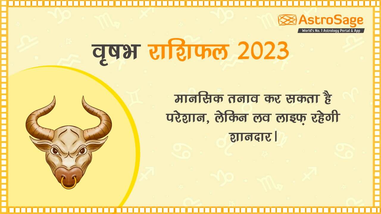 इस वृषभ राशिफल 2023 (Vrishabh Rashifal 2023) में आप जानेंगे कि आगामी नववर्ष 2023 आपके जीवन के विभिन्न पहलुओं जैसे कि करियर, शिक्षा, आर्थिक जीवन, पारिवारिक जीवन, संतान, वैवाहिक जीवन, व्यापार, संपत्ति और वाहन, धन और लाभ एवं स्वास्थ्य आदि के लिए कैसा रहने वाला है। हम आशा करते हैं कि वैदिक ज्योतिष पर आधारित यह राशिफल आपको अपना नया साल ख़ुशनुमा बनाने के लिए मददगार साबित होगा।