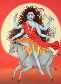 The most horrendous appearance of Durga is in form of Kalaratri. Devi Kalratri is the seventh aspect of Durga and Worshiped among Navdurga. She is believed to be the most violent Devi among Navdurga. She has dark krishna (black) complexion and her appearance is extremely fearful. Her large red eyes, open red tongue, and sobre on hand violently demolish devils and monsters. She is also glorified with name 'Kali Maa'. Devi Kalaratri has three round eyes, and scattered long black hair. She wears a bead that gleams like fire of electric power. Durga manifested herself as completely destroy the dirt and demons from existence. She is revered with name Kalratri, because she represents herself as a death of Kaal appeared like a dark night for demons. Donkey is her procession, as she rides on gadarbh. Goddess Kalaratri also has four arms. She holds sobre in her upper left hand and thorn of iron in lower left hand. Her upper right hand is in Var Mudra and lower right hand is in Abhay Mudra. Her splendor is limitless. She removes any kind of fear in life. During seventh day of Navaratri, Sadhak or devotee enters in Sahastrar chakra. After immersing oneself in Sahastrar Chakra, devotees are able to see the entrance of getting complete perfection in Universe.