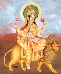 She is represented with four-arm holding six-faced infant Kumar Kartikey in her lap. Her both right and left upper hands hold lotus flower. She is also revered with name 'Padamasana devi' as she seats on lotus in state of meditation. Worshipping mother of Skanda on the fifth day of Navratri Pooja has also great significance. Her elegant appearance mesmerizes the worshippers. She is the true Goddess of purity. By offering invocation to this almighty, worshippers can travel the tranquil Universe to pacify their soul and mind. This great journey makes them realize the heavenly truth of life. They leave their sorrows behind and achieve the great and divine contentment in life.