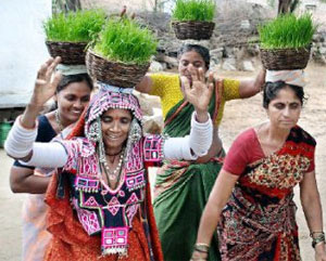 Teej festival is celebrated in the state of Andhra Pradesh by the Banjara (nomads) tribe. Here, Teej is celebrated for over a week. Day 1 begins with unmarried girls putting wheat in a small bamboo basket.