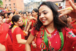 The festival of Tay or Teej is celebrated with great zeal in Nepal. It is like a very major festival there. Nepali Teej is famous all around. The first day of Nepali Teej is known as 'Dar Khane Din'. On this day, people from Bahun and Chhetri sects assemble at one place and participate in singing and dancing. Nepali Teej continues for three days, and the final rituals end with the purification of human souls. Women also observe a Nirjala Teej Vrat (abstaining from water) for 24-hours. On the third and last day of Nepali Teej, married women are absolved from their sins.