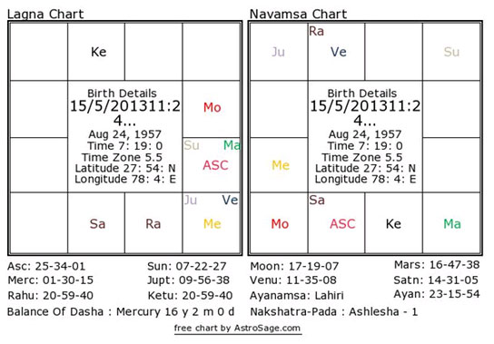 Let us now focus a bit on Dashas (periods). The Native was born under the Dasha (Period) of Mercury. Therefore, it is obvious that the Native would be interested in jobs related to counting and voice. Since the time native was 17, he has been under the good influence of Dasha (Period) of Ketu (Descending Lunar Node), which continued till he turned 24. This is the age when one decides career. So, there was great influence of Ketu in deciding the profession of the native. Ketu is said to be the accountant in Astrology. Further, it is not like that Ketu will always make a Chartered Accountant, as it has other significations too. The effects of other planets contribute in making the native a 'Chartered Accountant'.
