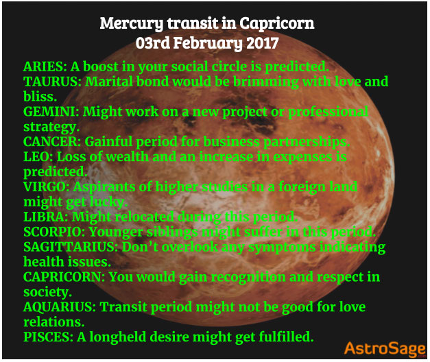 Natives who are doing business during this Mercury Transit in Capricorn may not be able to secure high profits in their line of business. This could be due to the fact several new competitors who are into business may exercise their strong domination and may gain more profits. Due to this, natives who belong to this sign may not be able to meet with very high profits in their business during this course of time and at the same time may gain only moderate profits.