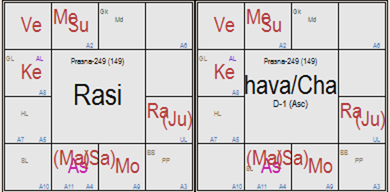 Here the sub lord of 6th house is Rahu, he is in 10th house in the star of Venus and sub division of Mercury. Venus is in 5th house whereas Mercury is in the star of Sun, therefore Rahu is strong for 5-6 houses.