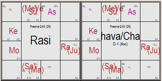 Here the sub lord of 6th house is Venus, she is in 12th house in the star of Ketus and sub division of Mars. Kethu is in 10th house whereas Mars is in 7th house in Saturn star. Mars and Saturn are retro in 7th house.
