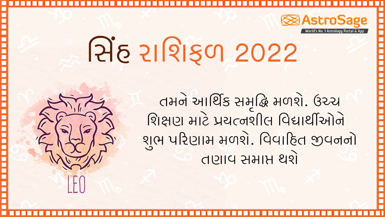 સિંહ રાશિફળ 2022 વૈદિક જ્યોતિષ પર આધારિત છે. આ વિશેષ લેખ દ્વારા, તમે સરળતાથી જાણી શકો છો કે વર્ષ 2022 માં સિંહ રાશિ ના જાતકોનું જીવન આર્થિક પાસા, આરોગ્ય, પારિવારિક જીવન અને આવા અન્ય મહત્વના પાસાઓની દ્રષ્ટિએ કેવું રહેશે. વાર્ષિક રાશિફળ 2022 મુજબ, આ વર્ષે તમને જીવનના વિવિધ પાસાઓમાં અવરોધોનો સામનો કરવો પડી શકે છે, જેના કારણે તમે આત્મવિશ્વાસ અને કુશળતા સાથે તેનો સામનો કરી શકશો. આ વર્ષે તમારા પરિવારમાં શાંતિ રહેશે અને તમે આખું વર્ષ સકારાત્મક વિચારોથી ભરપૂર રહેશો અને કામ અને સંબંધોમાં સકારાત્મક ઉર્જાનો ભરપૂર ઉપયોગ કરશો. સિંહ રાશિફળ 2022 મુજબ આ રાશિના વિદ્યાર્થીઓને શિક્ષણમાં અવરોધોનો સામનો કરવો પડી શકે છે. ઉપરાંત, આ વર્ષે તમારા બાળકોનું સ્વાસ્થ્ય તમારા માટે ચિંતાનું કારણ બની શકે છે. વર્ષ 2022 ની વાર્ષિક આગાહી મુજબ, આ વર્ષ પ્રોપર્ટી ખરીદવા માટે સારો સમય સાબિત થઈ શકે છે, અને પરિણીત યુગલોને બાળકો પણ મળી શકે છે. આ વર્ષે તમારી સામાજિક સ્થિતિ પણ વધી શકે છે અને આ સમય દરમિયાન તમારા પરિવારમાં શુભ કાર્યો પણ થઈ શકે છે.