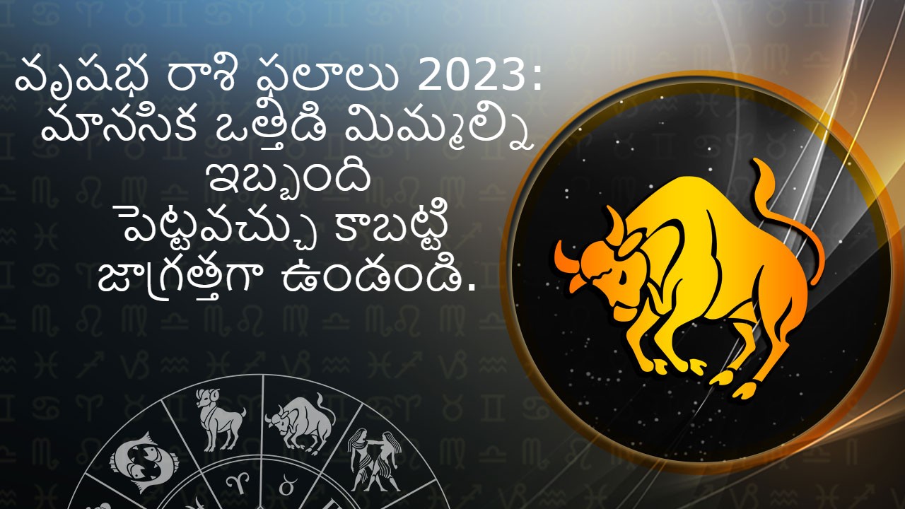 2023కి సంబంధించిన వృషభ రాశి ఫలాలు సంవత్సరం ప్రారంభంలో మీరు కొంత మానసిక ఒత్తిడిని కలిగి ఉండవచ్చని తెలుపుతుంది, ఇది మీ నిర్ణయాలు తీసుకునే సామర్థ్యంపై ప్రభావం చూపుతుంది. పని సంబంధిత ఒత్తిడి మరియు బాహ్య కారకాలు ఈ సమయంలో మీపై గణనీయమైన ప్రభావాన్ని చూపుతాయి మరియు మీరు ఈ సమయంలో విదేశాలకు వెళ్లవచ్చు కాబట్టి ఇది చాలా కీలకం. ఈ సమయంలో మీరు మీ దేశం వెలుపల నివసిస్తున్నారు లేదా ప్రయాణించే అవకాశం ఉంది.