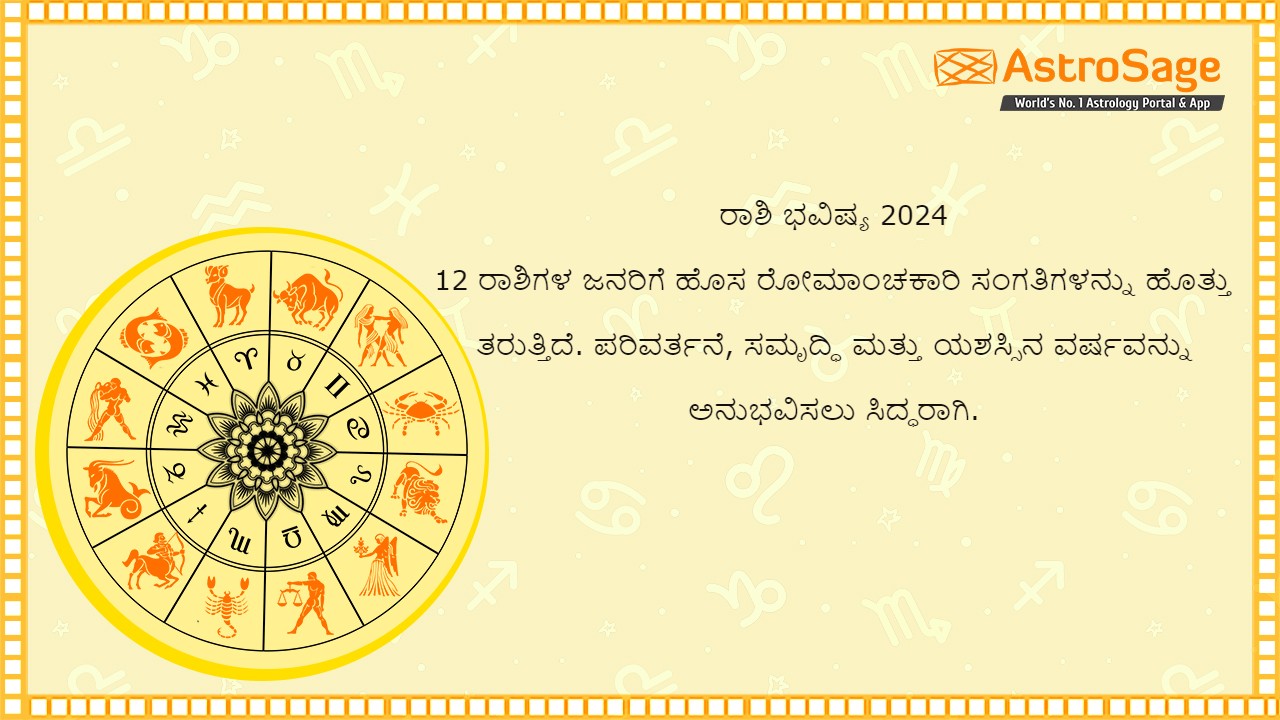 ರಾಶಿ ಭವಿಷ್ಯ 2024 (Rashi Bhavishya 2024)ವೈದಿಕ ಜ್ಯೋತಿಷ್ಯವನ್ನು ಆಧರಿಸಿದೆ ಮತ್ತು 2024 ರಲ್ಲಿ ಜ್ಯೋತಿಷ್ಯ ಘಟನೆಗಳು ಮತ್ತು ಗ್ರಹಗಳ ಚಲನೆಯನ್ನು ಗಣನೆಗೆ ತೆಗೆದುಕೊಳ್ಳುತ್ತದೆ. ಆಸ್ಟ್ರೋಸೇಜ್ನ ಪರಿಣಿತ ಜ್ಯೋತಿಷಿಗಳು ಎಚ್ಚರಿಕೆಯಿಂದ ಮತ್ತು ನಿಖರವಾದ ಲೆಕ್ಕಾಚಾರಗಳು ಮತ್ತು ವಿಶ್ಲೇಷಣೆಯ ನಂತರ ಈ ಜಾತಕವನ್ನು ರಚಿಸಿದ್ದಾರೆ. 2024 ರ ಈ ವಾರ್ಷಿಕ ಮುನ್ಸೂಚನೆಯು ನಿಮ್ಮ ವೈಯಕ್ತಿಕ ಜೀವನ, ವೃತ್ತಿಪರ ಜೀವನ, ವೃತ್ತಿ, ಶಿಕ್ಷಣ, ಪ್ರೇಮ ಜೀವನ, ವೈವಾಹಿಕ ಜೀವನ ಮತ್ತು ಆರೋಗ್ಯದ ಕುರಿತು ಪ್ರಮುಖ ಮಾಹಿತಿಯನ್ನು ನೀಡುತ್ತದೆ. ರಾಶಿ ಭವಿಷ್ಯ 2024 (Rashi Bhavishya 2024) ರ ಮಾರ್ಗದರ್ಶನದೊಂದಿಗೆ ನೀವು ನಿಮ್ಮ ಜೀವನವನ್ನು ಹೆಚ್ಚು ಸಮೃದ್ಧ ಮತ್ತು ಯಶಸ್ವಿಗೊಳಿಸಬಹುದು ಮತ್ತು ಕಷ್ಟದ ಸಮಯದ ಪ್ರಭಾವಗಳನ್ನು ತಿಳಿದುಕೊಳ್ಳುವ ಮೂಲಕ ನೀವು ಮುಂಬರುವ ಸಮಸ್ಯೆಗಳನ್ನು ದಾಟಬಹುದು.