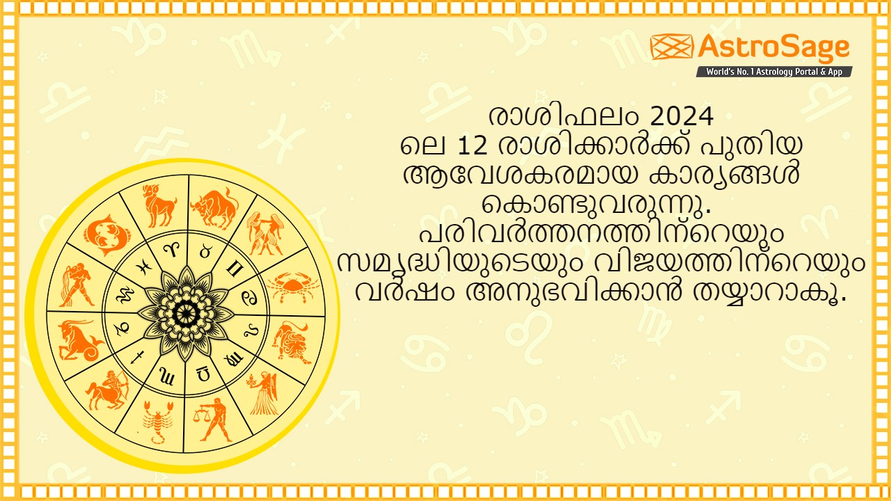 രാശിഫലം 2024 (Rashiphalam 2024) ജാതകം വേദ ജ്യോതിഷത്തെ അടിസ്ഥാനമാക്കിയുള്ളതാണ്, കൂടാതെ 2024 ലെ ജ്യോതിഷ സംഭവങ്ങളും ഗ്രഹ ചലനങ്ങളും കണക്കിലെടുക്കുന്നു. ആസ്ട്രോസേജിന്റെ വിദഗ്ധരായ ജ്യോതിഷികൾ സൂക്ഷ്മവും കൃത്യവുമായ കണക്കുകൂട്ടലുകൾക്കും വിശകലനങ്ങൾക്കും ശേഷം ഈ ജാതകം സൃഷ്ടിച്ചു.