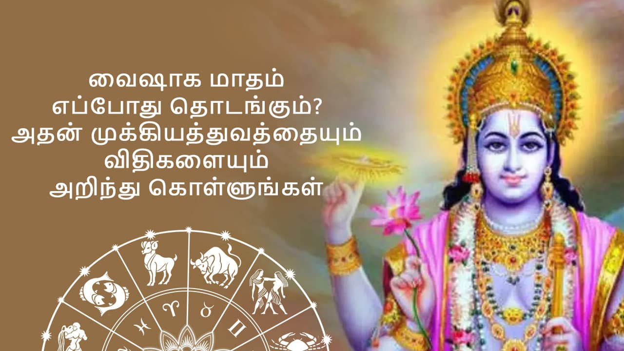 வைஷாக மாதம் ஞாயிற்றுக்கிழமை, 21 ஏப்ரல், 2024 அன்று தொடங்கி, 21 மே, 2024 செவ்வாய் அன்று முடிவடையும். மத நம்பிக்கைகளின்படி, வைஷாக் மாதம் விஷ்ணு மற்றும் ஸ்ரீ கிருஷ்ணரை வணங்குவதற்கு அர்ப்பணிக்கப்பட்டுள்ளது. இம்மாதத்தில் நீராடுதல், தானம் செய்தல், அர்ச்சனை செய்தல், பரிகாரம் செய்தல் போன்றவற்றால் பக்தர்கள் மகிழ்ச்சியும், வளமும் பெறுவதுடன், பலவிதமான இன்னல்களில் இருந்து விடுபடுவார்கள். நட்சத்திரக் கூட்டத்தின் அதிபதி குரு மற்றும் அதன் தெய்வம் இந்திரன். எனவே, இம்மாதத்தில் சந்திரனை வழிபடுவதும் மிகவும் முக்கியமானதாகக் கருதப்படுகிறது. இம்மாதத்தில் அனைத்து தெய்வங்களையும் வழிபடுவதன் மூலம், அனைத்து பிரச்சனைகளிலிருந்தும் விடுபடுவதுடன், நபர் மகிழ்ச்சி, செழிப்பு மற்றும் செல்வத்தை அடைவார் என்று ஒரு மத நம்பிக்கை உள்ளது.