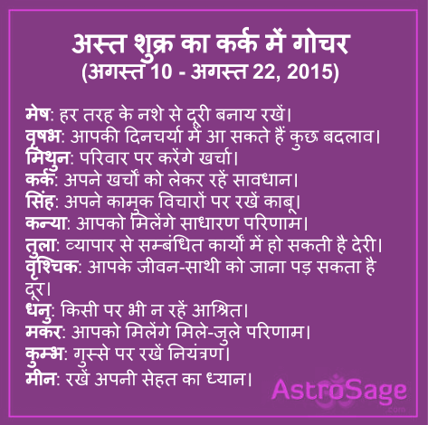 अस्त शुक्र का कर्क में गोचर (अगस्त 10 - अगस्त 22, 2015)
