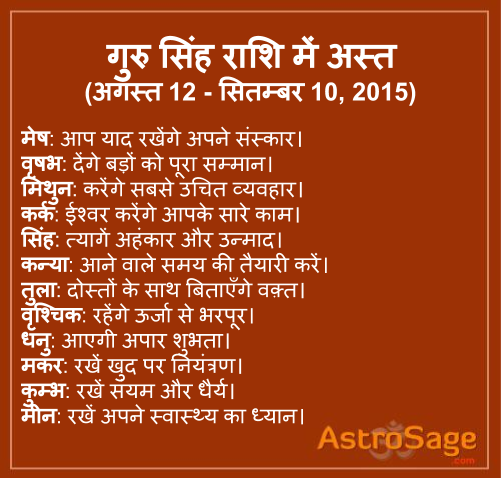 अगस्त 12, 2015 को ग्रह गुरु सिंह राशि में अस्त हो जाएंगे। 10 सितम्बर को पुनः इनका उदय होगा। गुरु सभी शुभ कार्यों हेतु जाने जाते हैं, इनका नीच हो जाना अथवा अस्त हो जाना अच्छा नहीं माना जाता है। जब गुरु अस्त होते हैं तो सभी शुभ कार्यों को वर्जित कर दिया जाता है जैसे कुओं की खुदाई, नींव रखना, गृह प्रवेश, मुंडन, वाहन खरीदना, नया काम या व्यापार शुरू करना आदि।