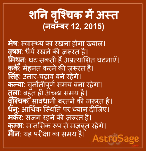 12 नवम्बर 2015 को शनि वृश्चिक में अस्त हो रहा है। जानिए कैसे रहेंगे परिणाम आपकी राशि के लिए। यह राशिफल लग्न राशि पर आधारित है।