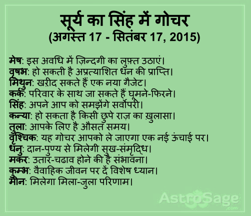 सूर्य का सिंह राशि में गोचर (अगस्त 17 - सितम्बर 17, 2015)