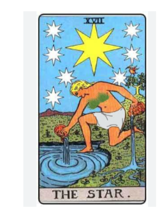 The Star, focuses on your optimism, which is represented by the use of colours like blue and yellow majorly. When you wish on the stars, you really believe you can achieve your heart's desires. Your job in this world is to convince others they can too, thereby helping to lead them home in a spiritual sense. The water and the green colour on the ground represent progress.