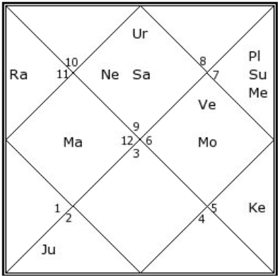 The horoscope has Gemini as ascendant, the ascendant lord Mercury is placed in the 7th house along with the 5th house lord Venus and the 3rd house lord Sun. It definitely made him good looking and very popular amongst the opposite gender. His link ups with multiple bollywood actresses are a reason for this conjunction but we must focus on Rahu for now. Rahu is placed in the 3rd house, much like that of Virat Kohli but in Khanna’s horoscope, Rahu is placed in the inimical sign Leo with another enemy planet Moon being conjunct with it. Rahu and Moon, two enemies being placed together, formed the ‘Grahan Yoga’.
