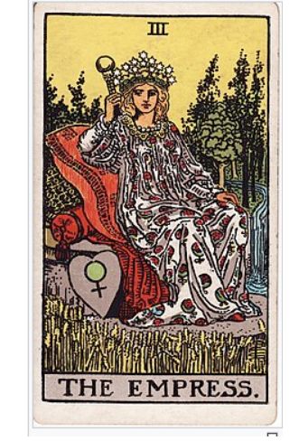 The Empress tarot card: It is evident that the Empress portrays a woman seated on a throne, signifying feminine authority. We can infer that this woman is the God of fertility, progress and abundance, the Earth Mother archetype, based on the plentiful natural surroundings. This card often signifies the planet Venus, therefore because of her grace, there is perfect love, peace, fertility, and luxury. The woman's golden hair, adorned with stars, symbolizes her heavenly bond with the otherworldly domain.