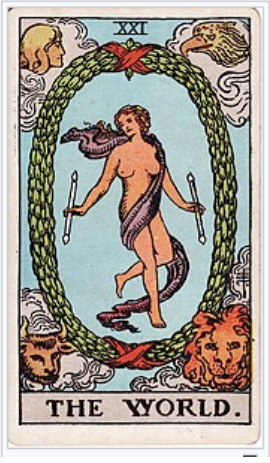 One look at The World tarot card and you are sure to notice a dancing female figure in the center. The dancing figure on the card has one leg crossed over the other and holds a wand in either hand. She symbolizes balance and evolution in movement. The fulfillment and unity that she represents is not one that is static, but ever-changing, dynamic and eternal.